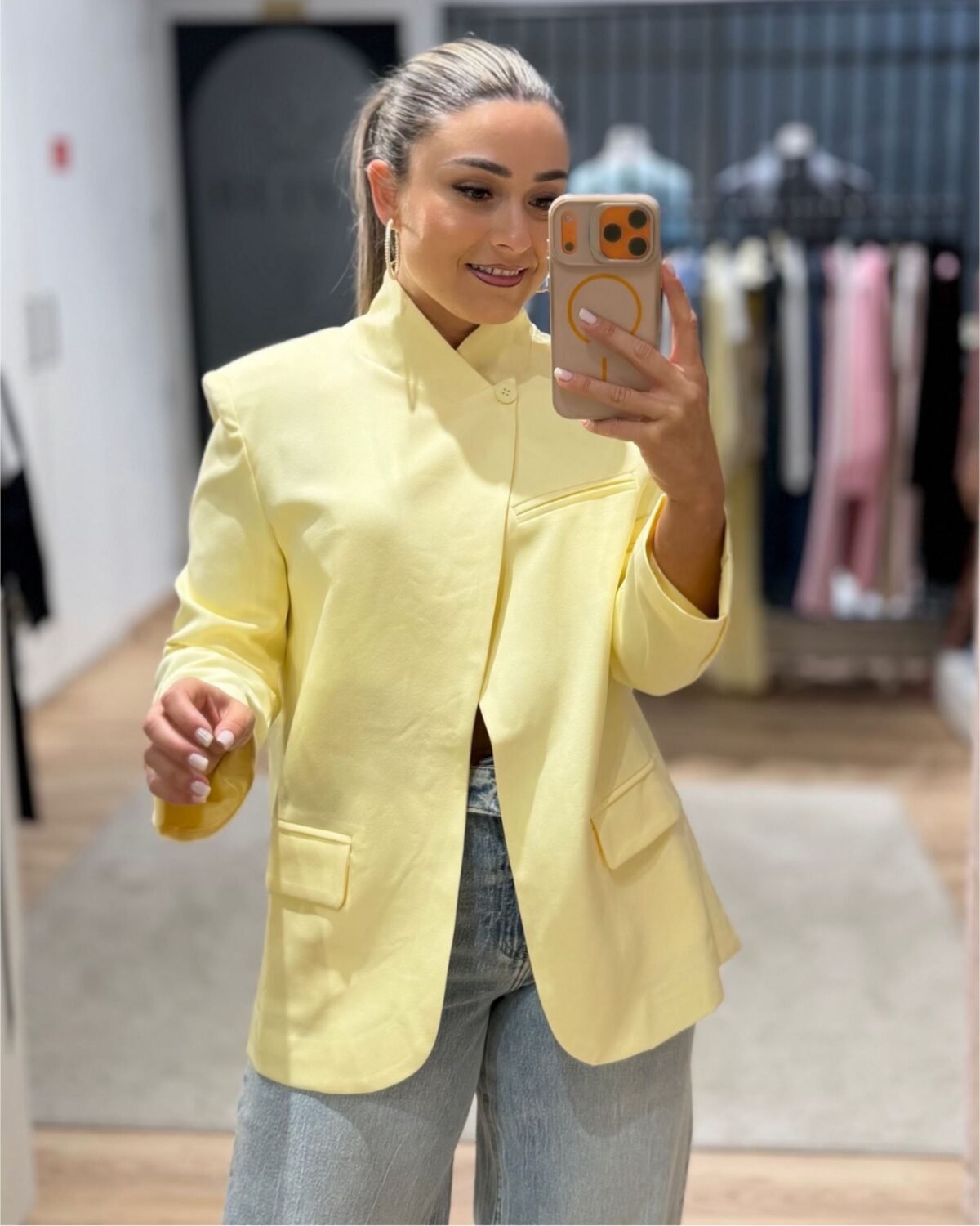 Num amarelo suave, super elegante, perfeito para dar vida até às combinações mais básicas. Tem um corte estruturado, mas confortável, e um detalhe nas costas que faz toda a diferença, foge do óbvio e deixa o look muito mais interessante. Peça versátil, diferente e cheia de personalidade.