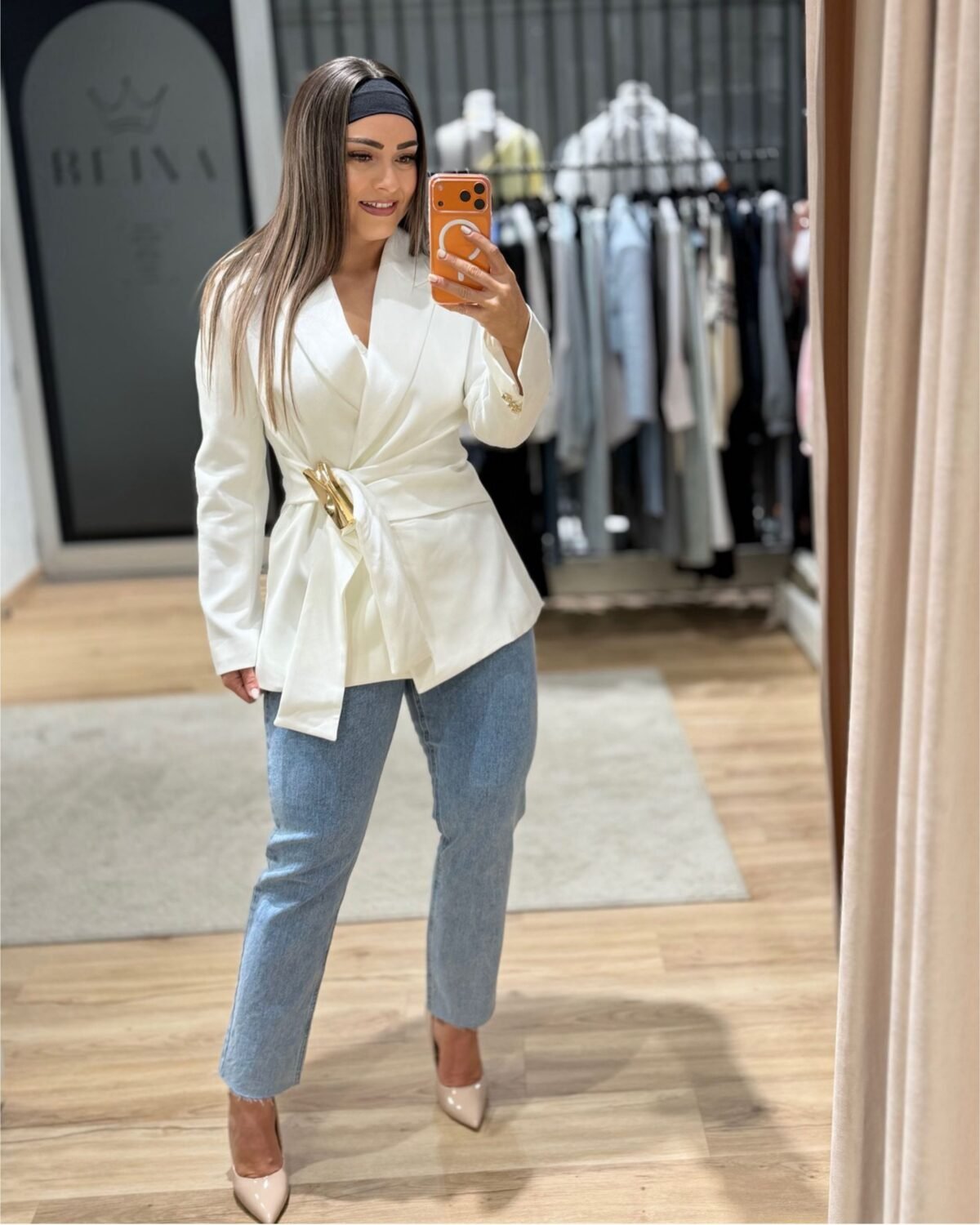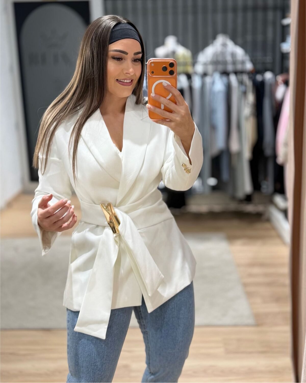Este blazer branco é aquela peça que transforma qualquer look. Tem um corte elegante, cintura marcada com cinto e detalhe dourado que dá um toque sofisticado. Fica perfeito tanto com jeans para um look mais casual, como com peças mais arranjadas para ocasiões especiais.