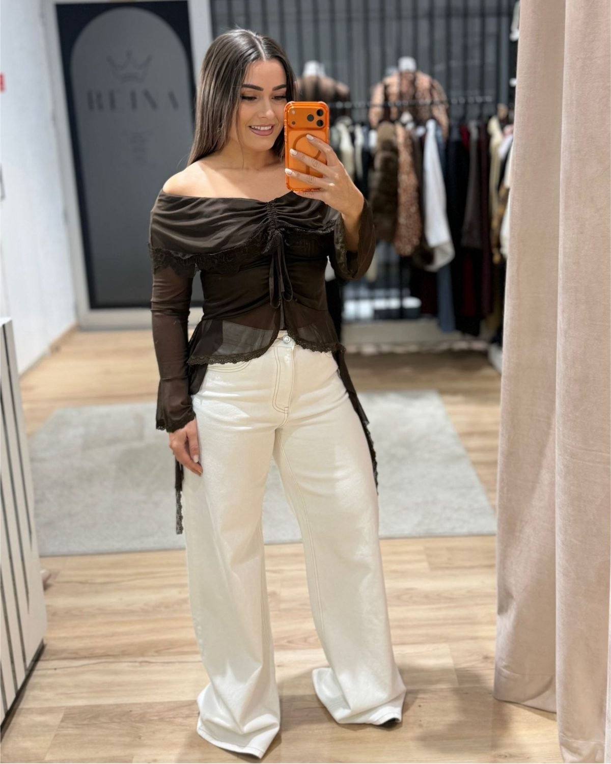 Modelo wide leg em jeans branco da marca Queen. Corte largo, super confortável e com aquele caimento que alonga a silhueta. Ficam lindas com tops mais justos, blazers ou camisolas mais curtas. Tanto resultam com saltos para um look mais elegante, como com ténis para algo mais descontraído.