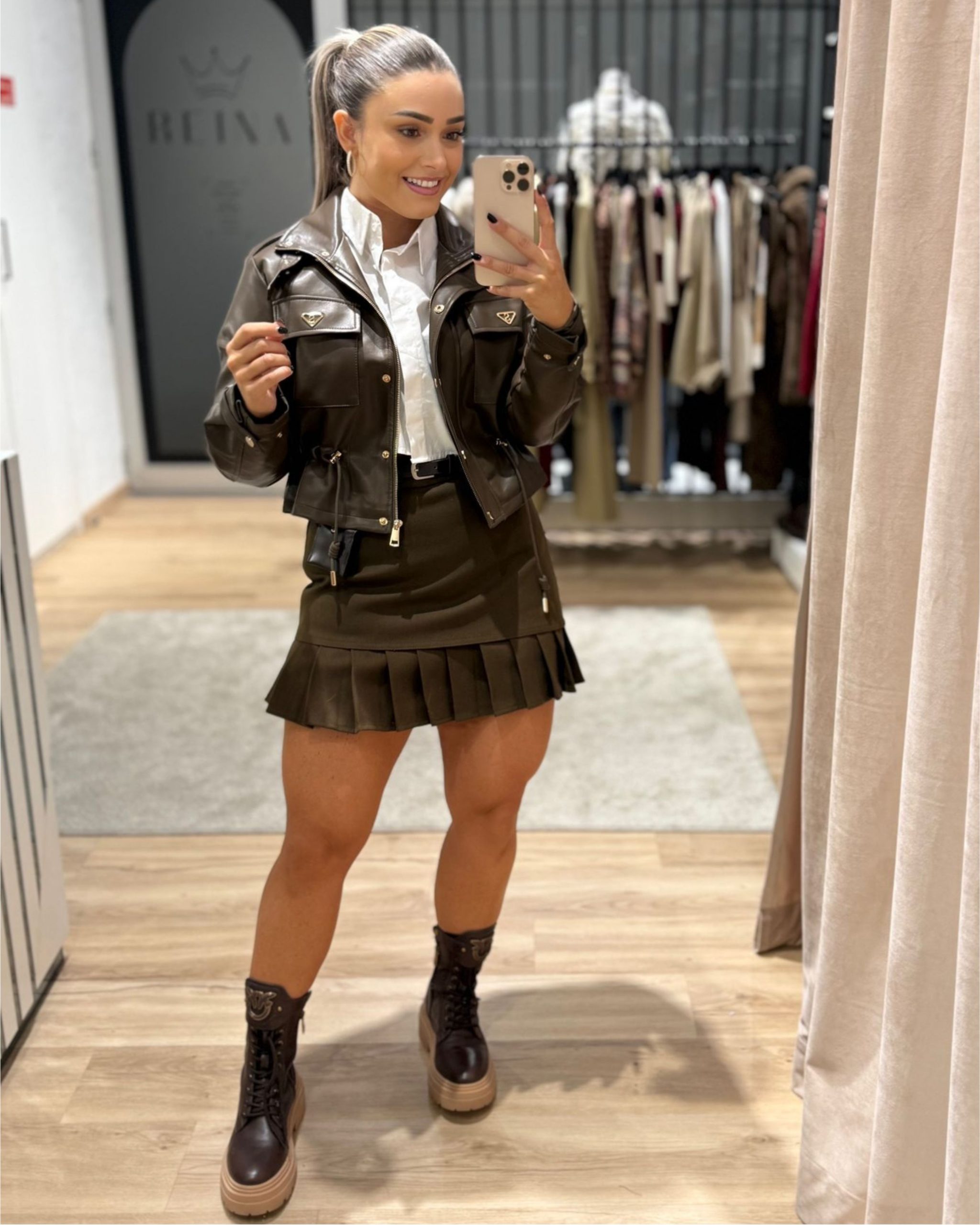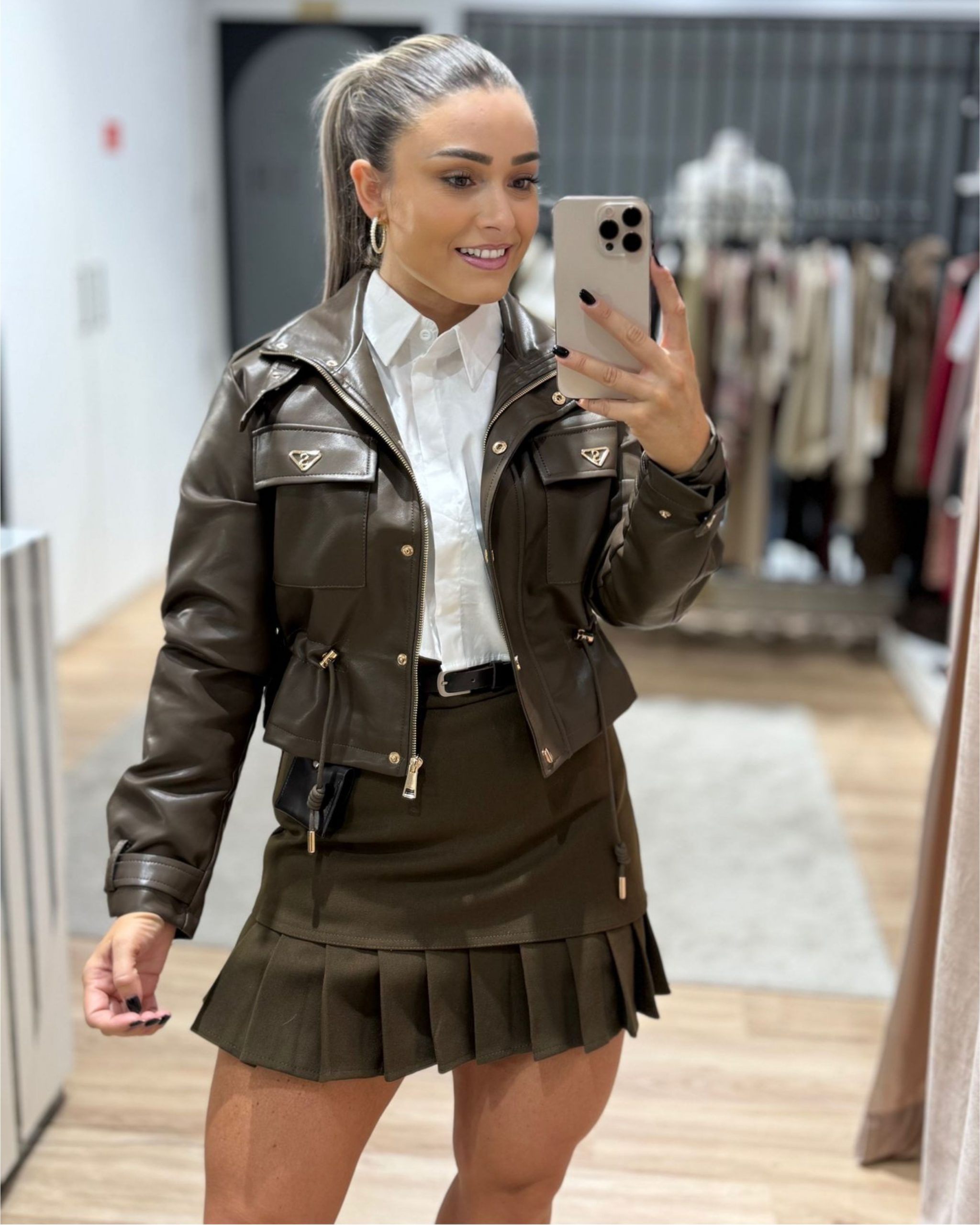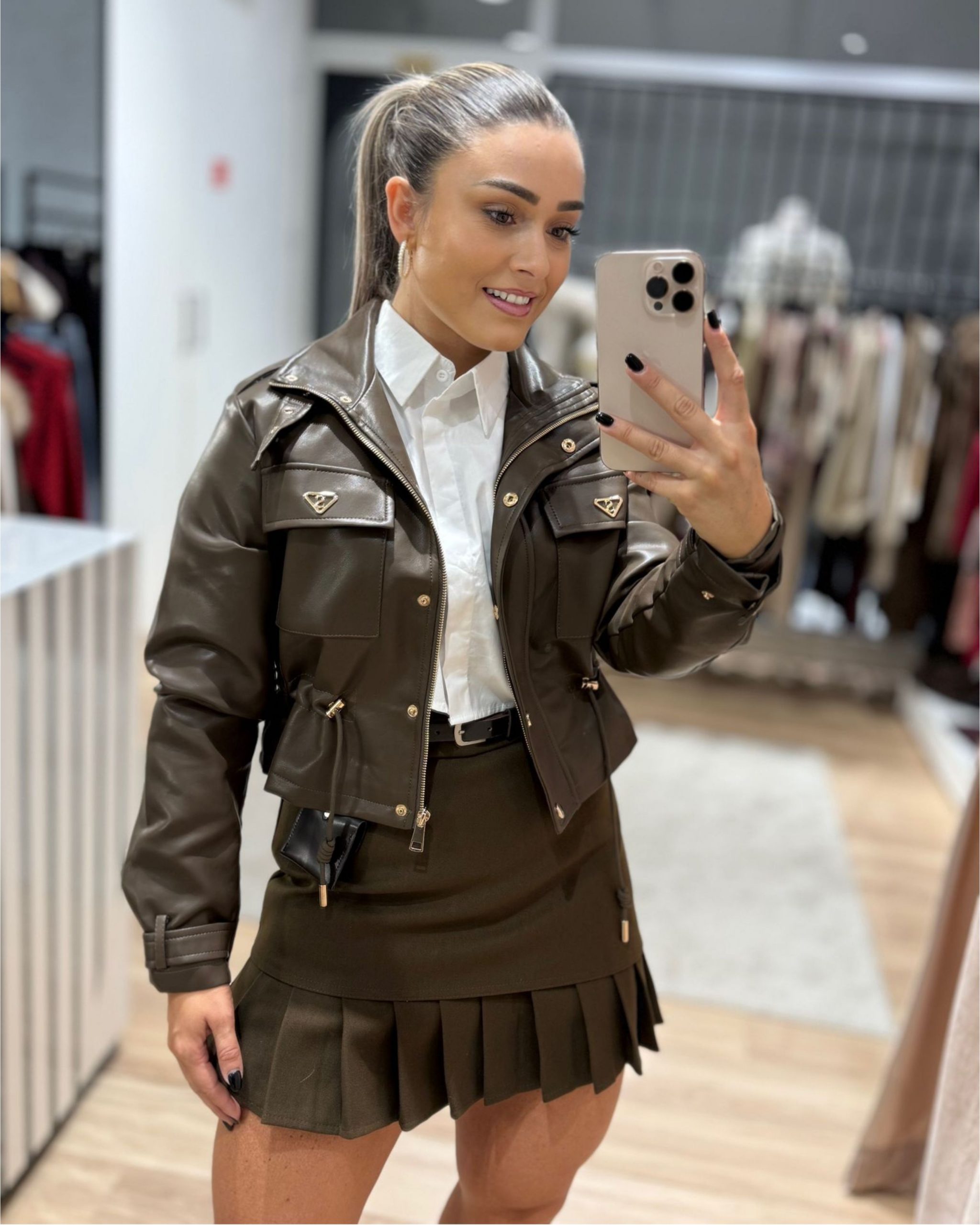 Perfeita para dar aquele toque ousado e moderno — esta casaca em ecopele é simplesmente um arraso! O corte é estruturado, o acabamento parece de luxo e os detalhes dourados dão-lhe aquele charme extra.