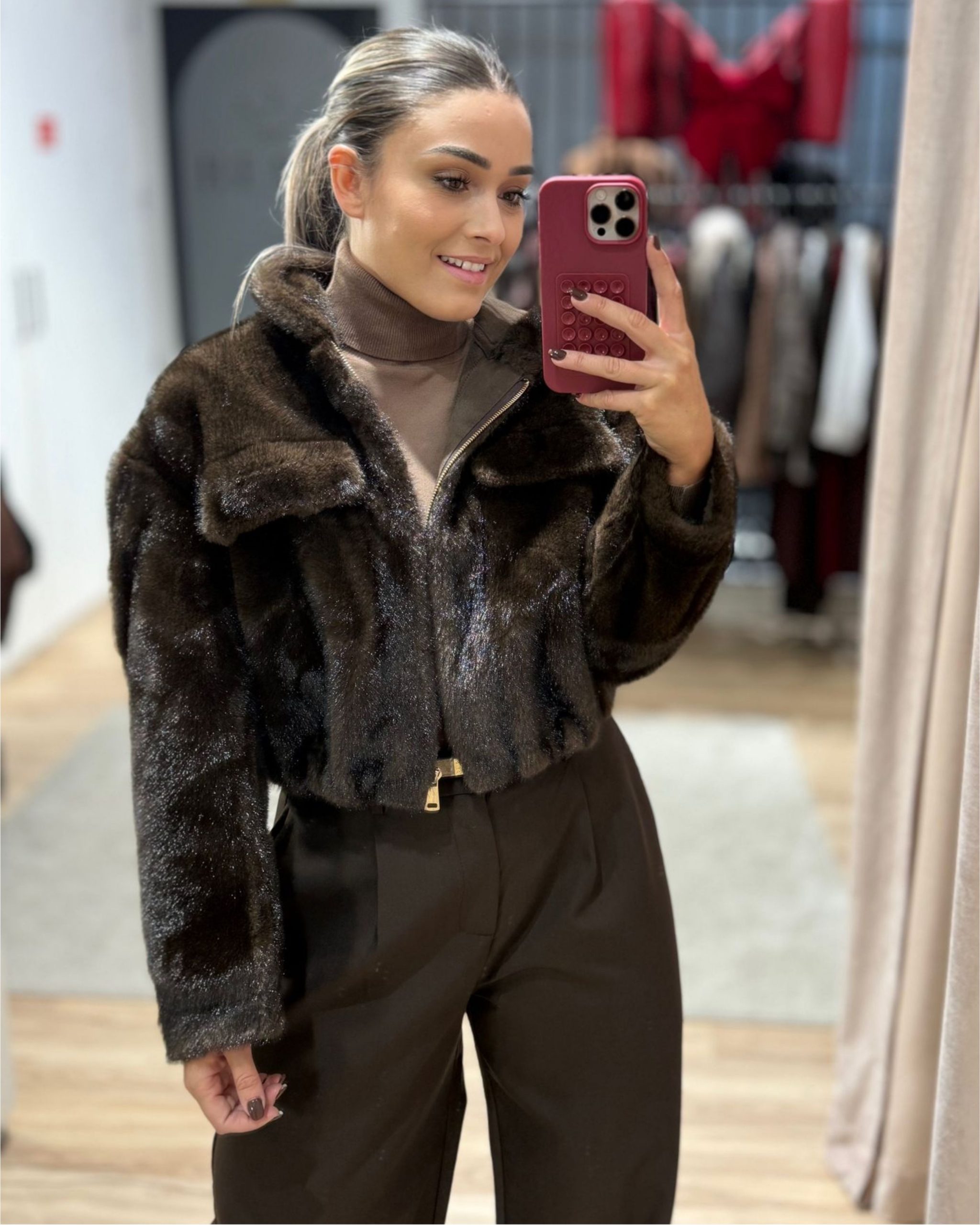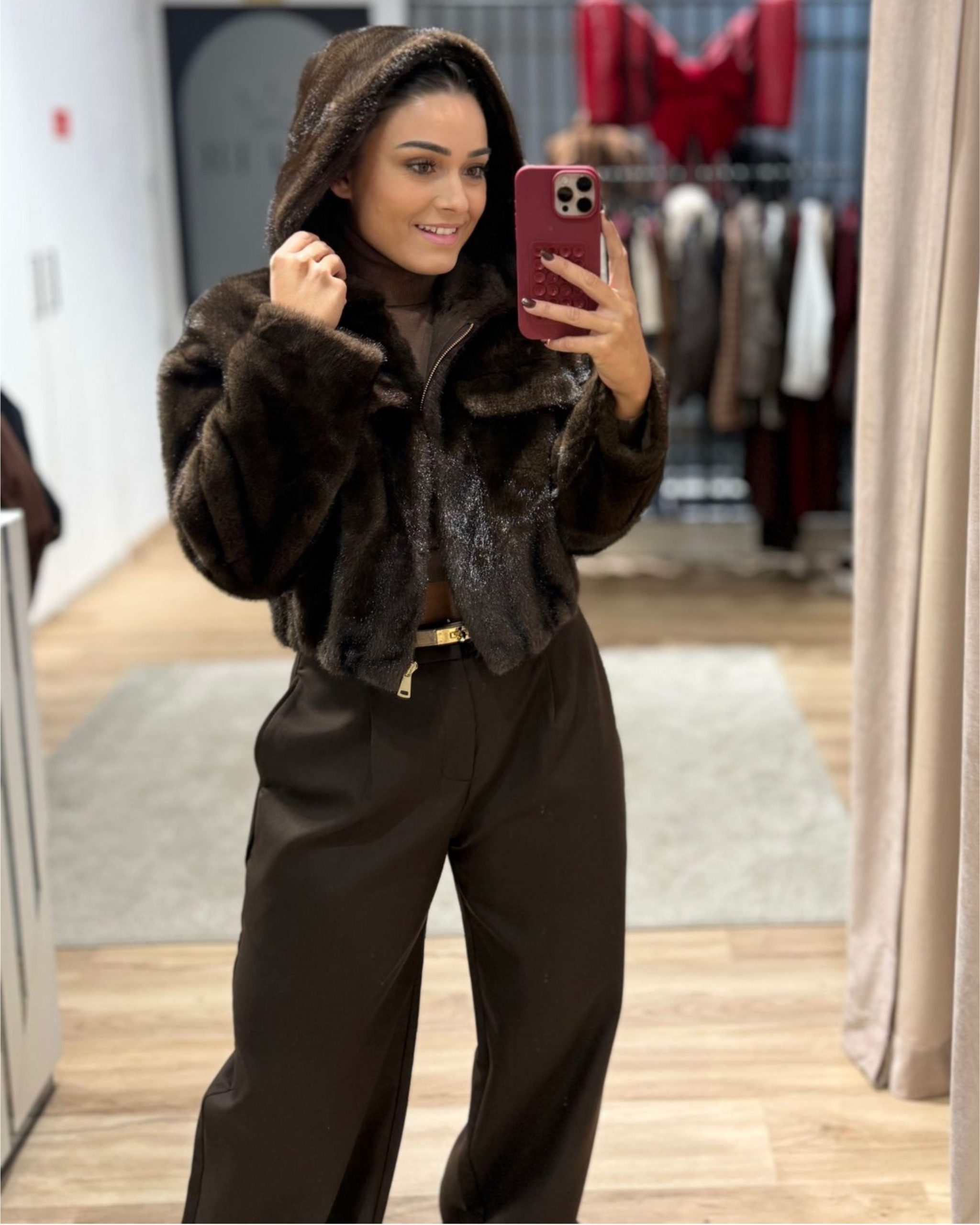 Casaco de pelo curto, super macio e quentinho. Tem capuz, fecho à frente e um corte mais curto que dá um ar moderno e elegante.