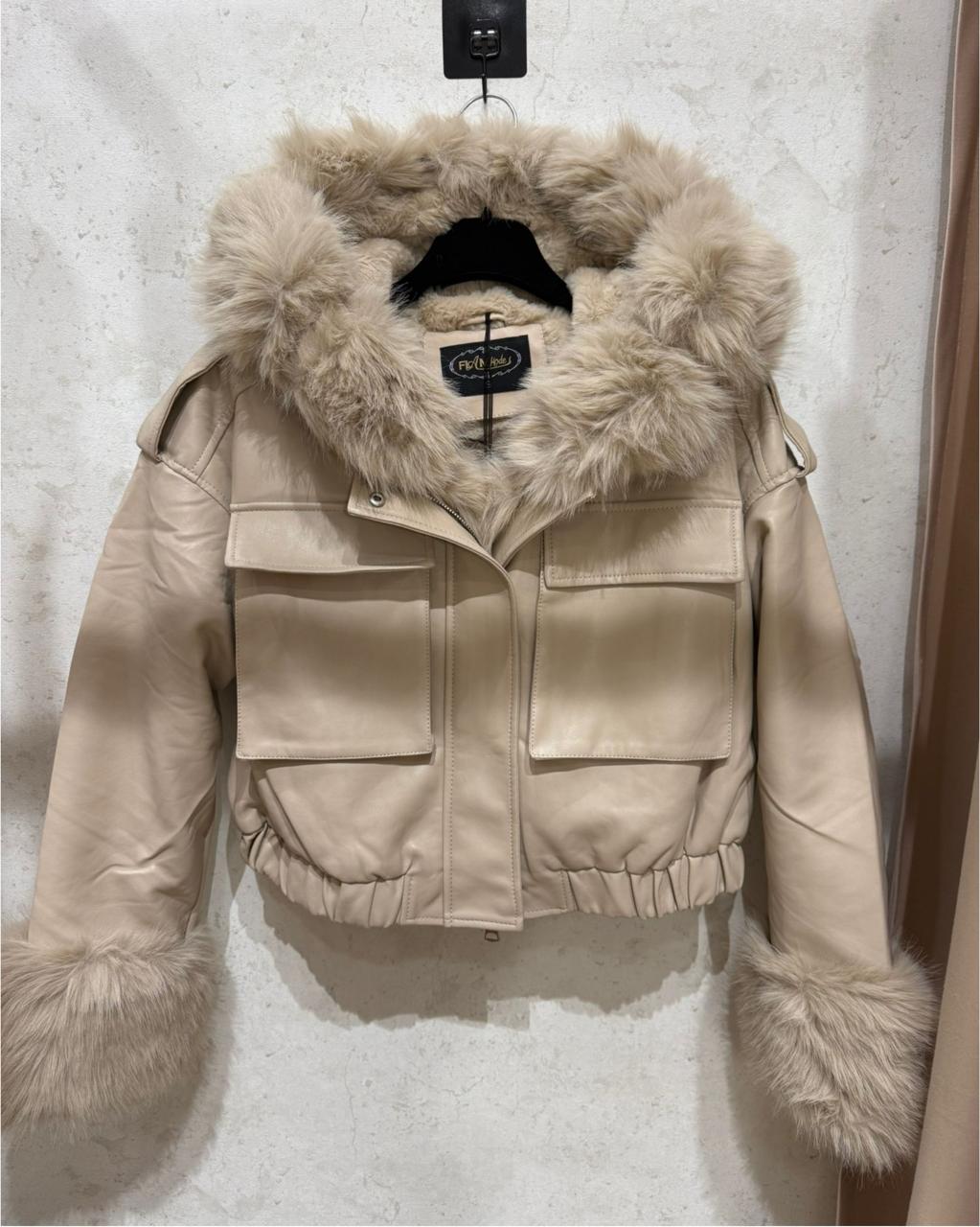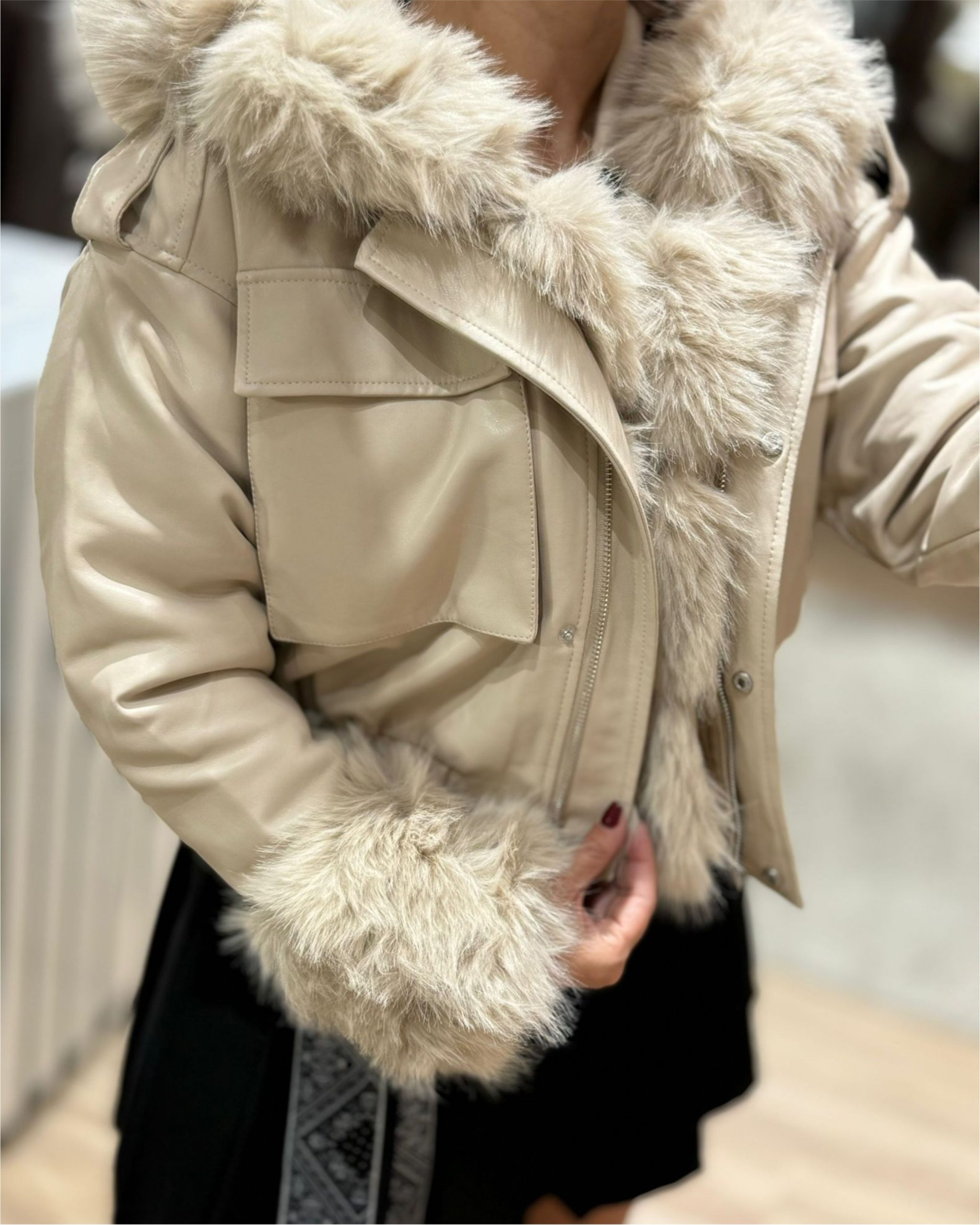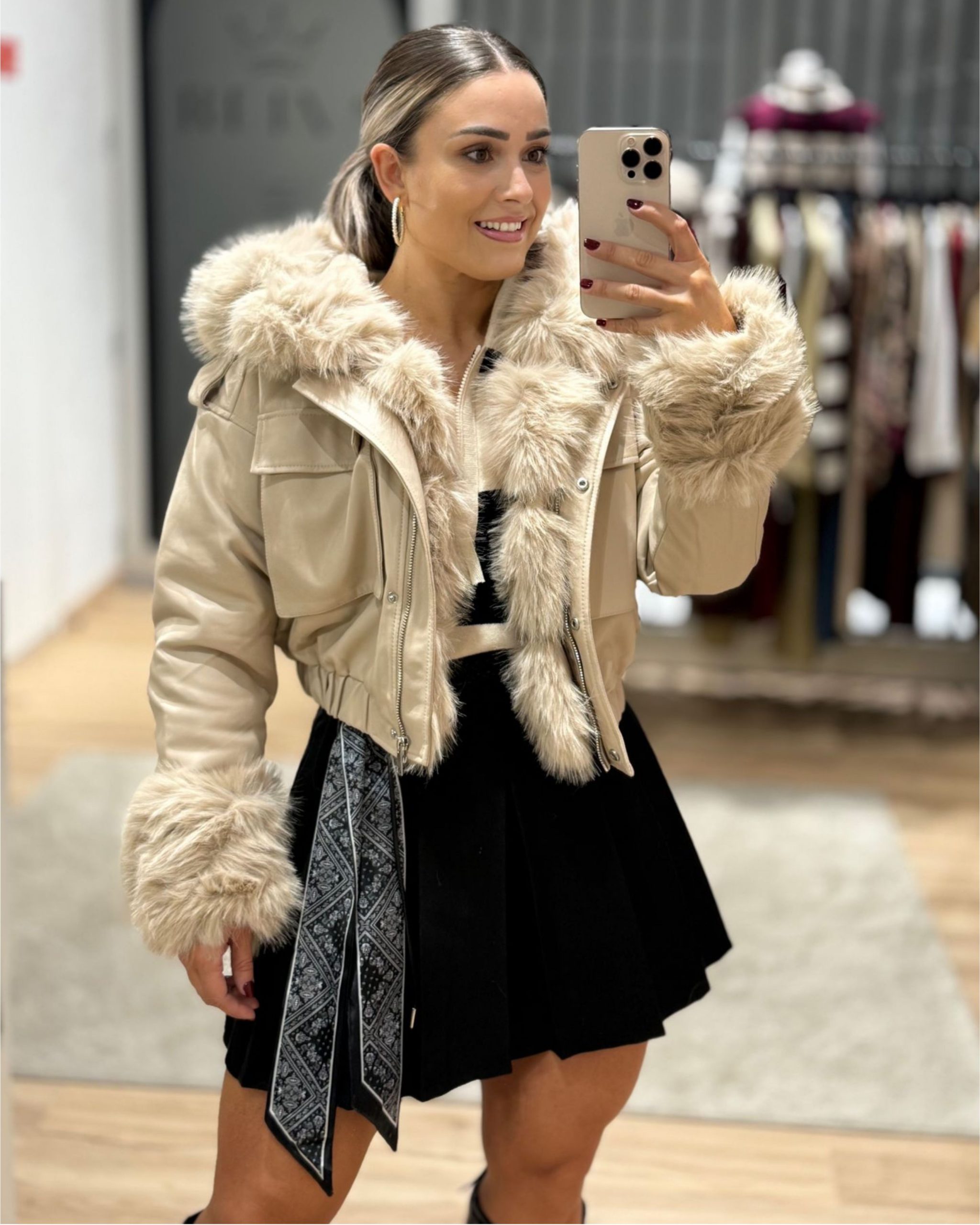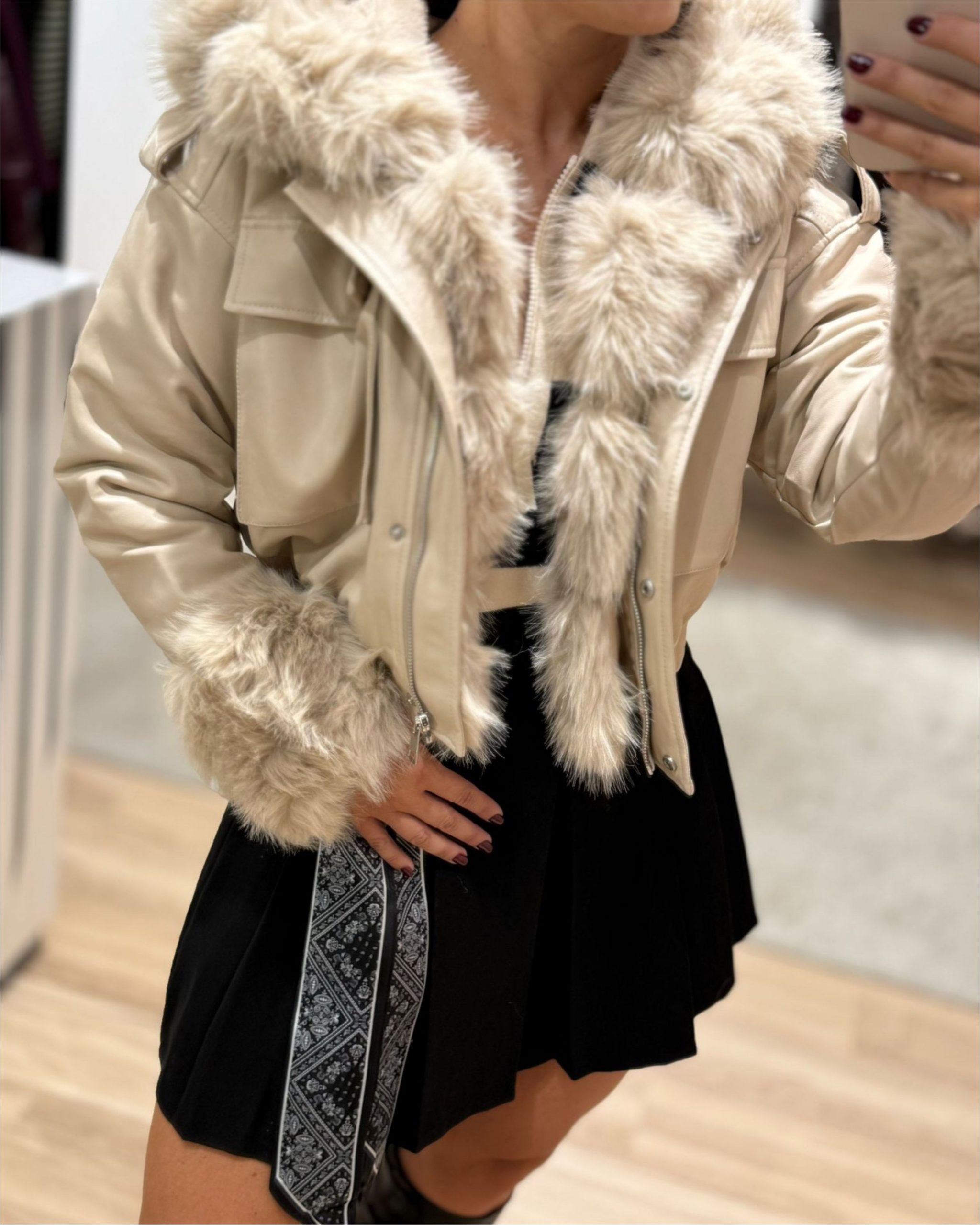 Este casaco em ecopele bege é simplesmente um arraso! O toque do pelo macio dá-lhe aquele ar de luxo, mas sem ser exagerado, é mesmo o equilíbrio certo entre chique e descontraído. O corte curtinho valoriza a silhueta e fica bem tanto com umas calças de ganga como com uma mini saia para um look mais ousado.