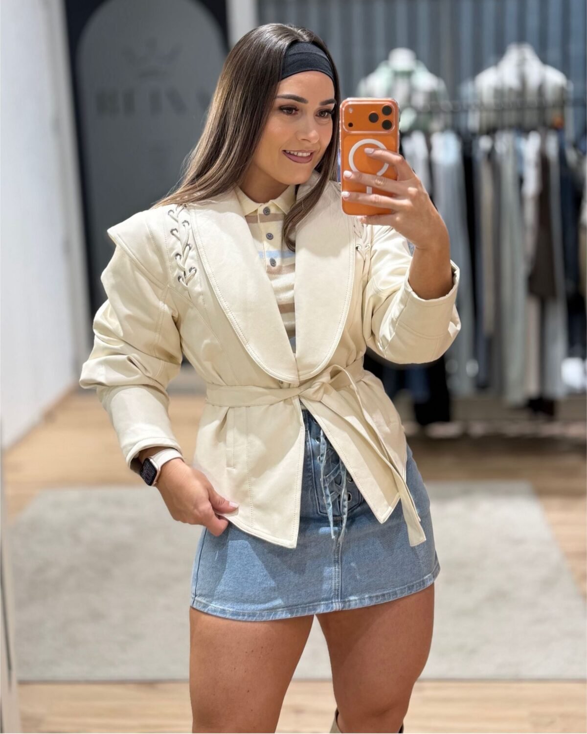 Casaco em ecopele super elegante, com corte que valoriza a silhueta e cinto para ajustar na cintura. Os detalhes nas mangas dão um toque diferente e mais moderno à peça.