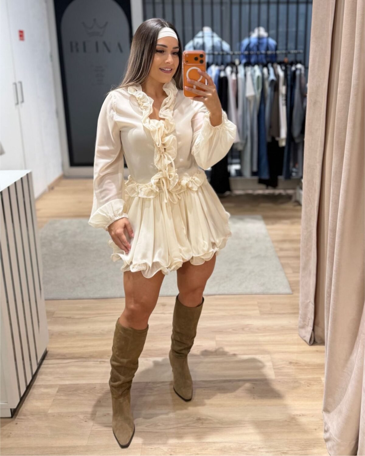 Esse conjunto é aquele equilíbrio perfeito entre romântico e elegante. Leve, fluido e cheio de movimento, com aqueles folhos que fazem toda a diferença no look. A parte de cima mais ajustada valoriza a silhueta e a saia dá aquele ar feminino e delicado sem esforço. Perfeito para dias em que queres sentir-te bonita…