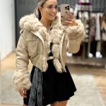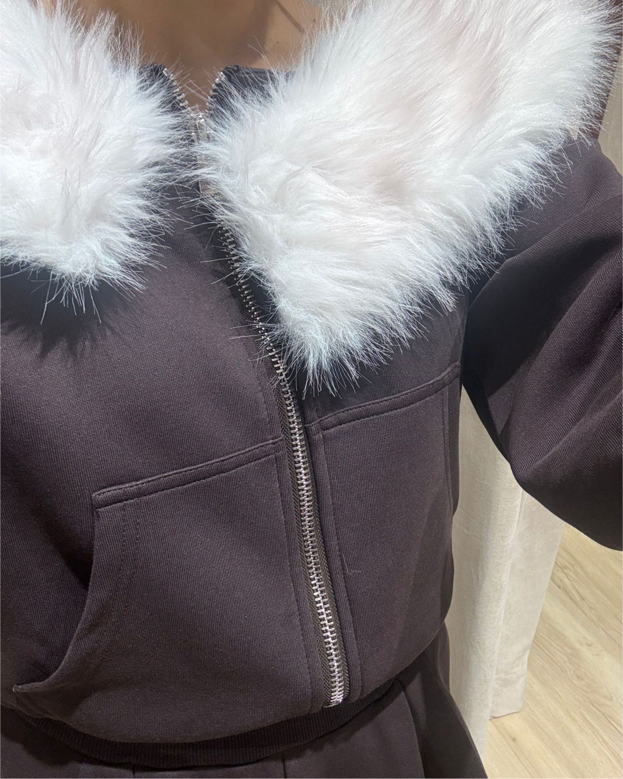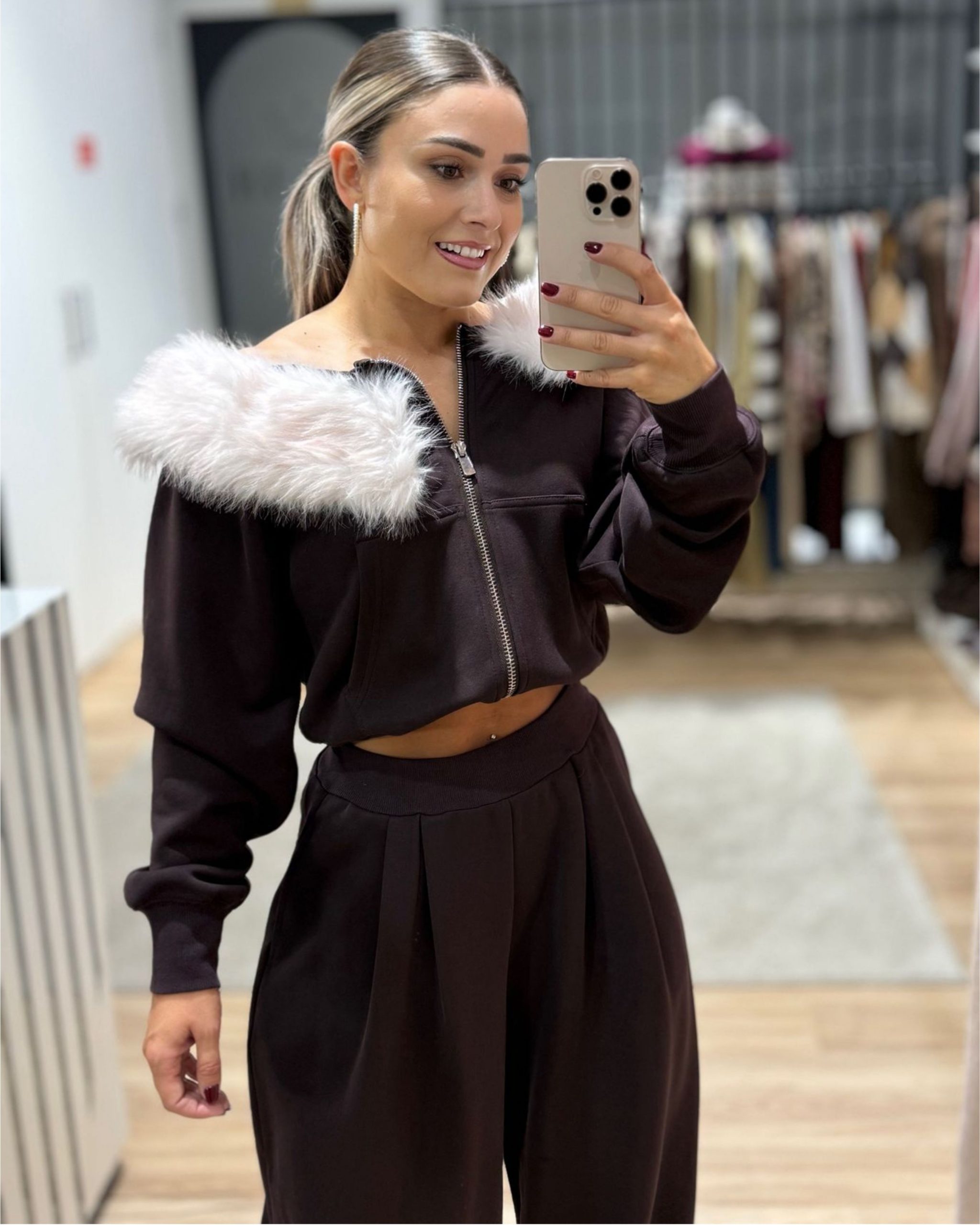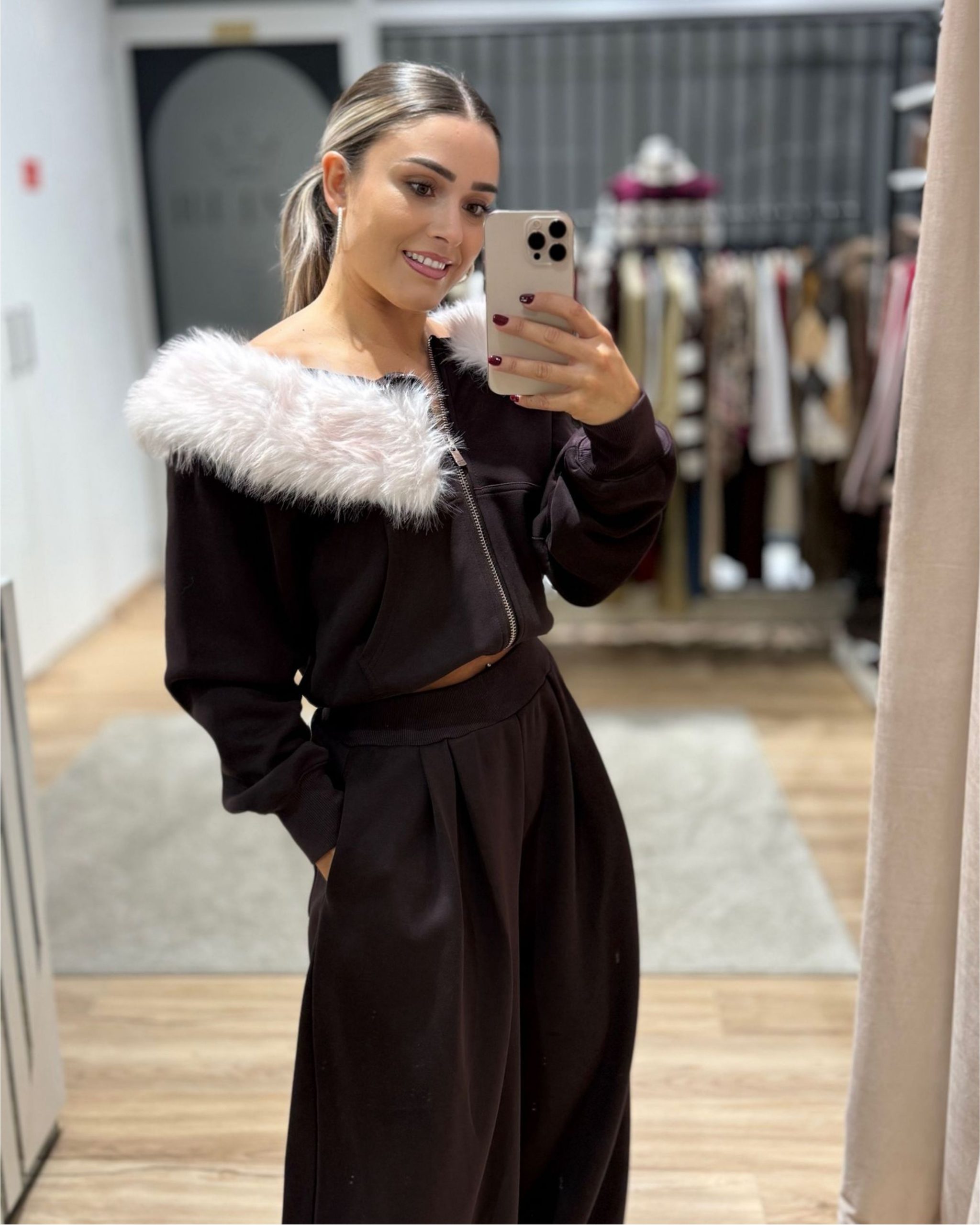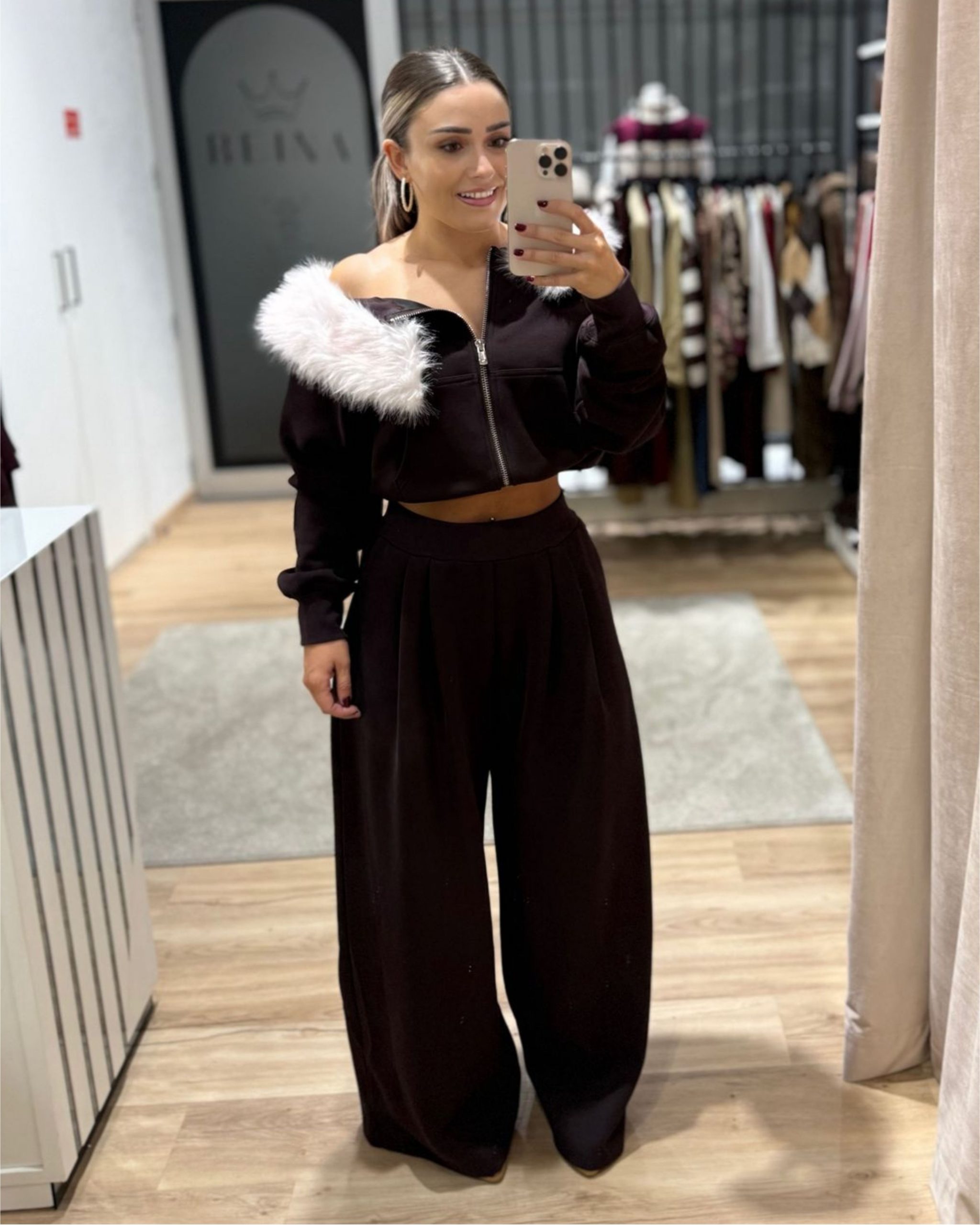 O casaco é curtinho, com fecho à frente e gola em pêlo bem fofinha, super quentinho e com um toque de estilo. As calças são largas e com pregas. Perfeito para um look casual mas cheio de charme, seja para um passeio ou um café com as amigas