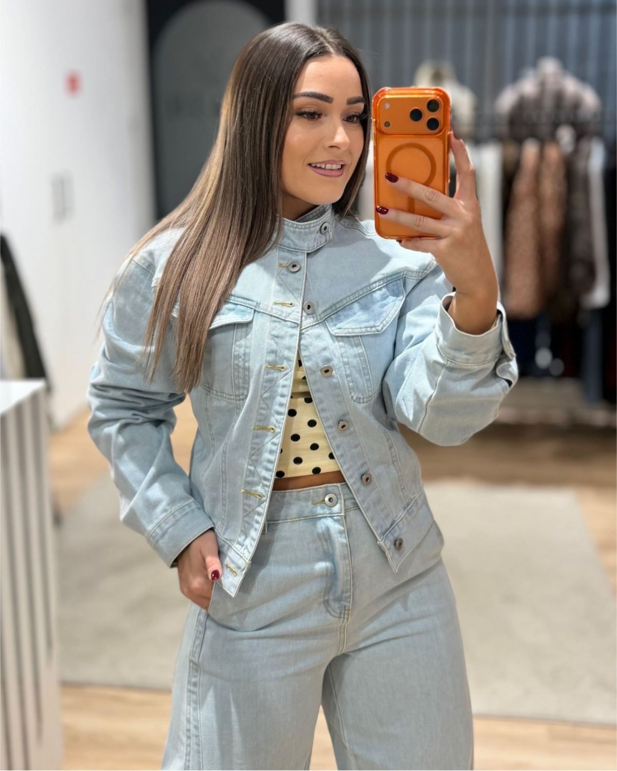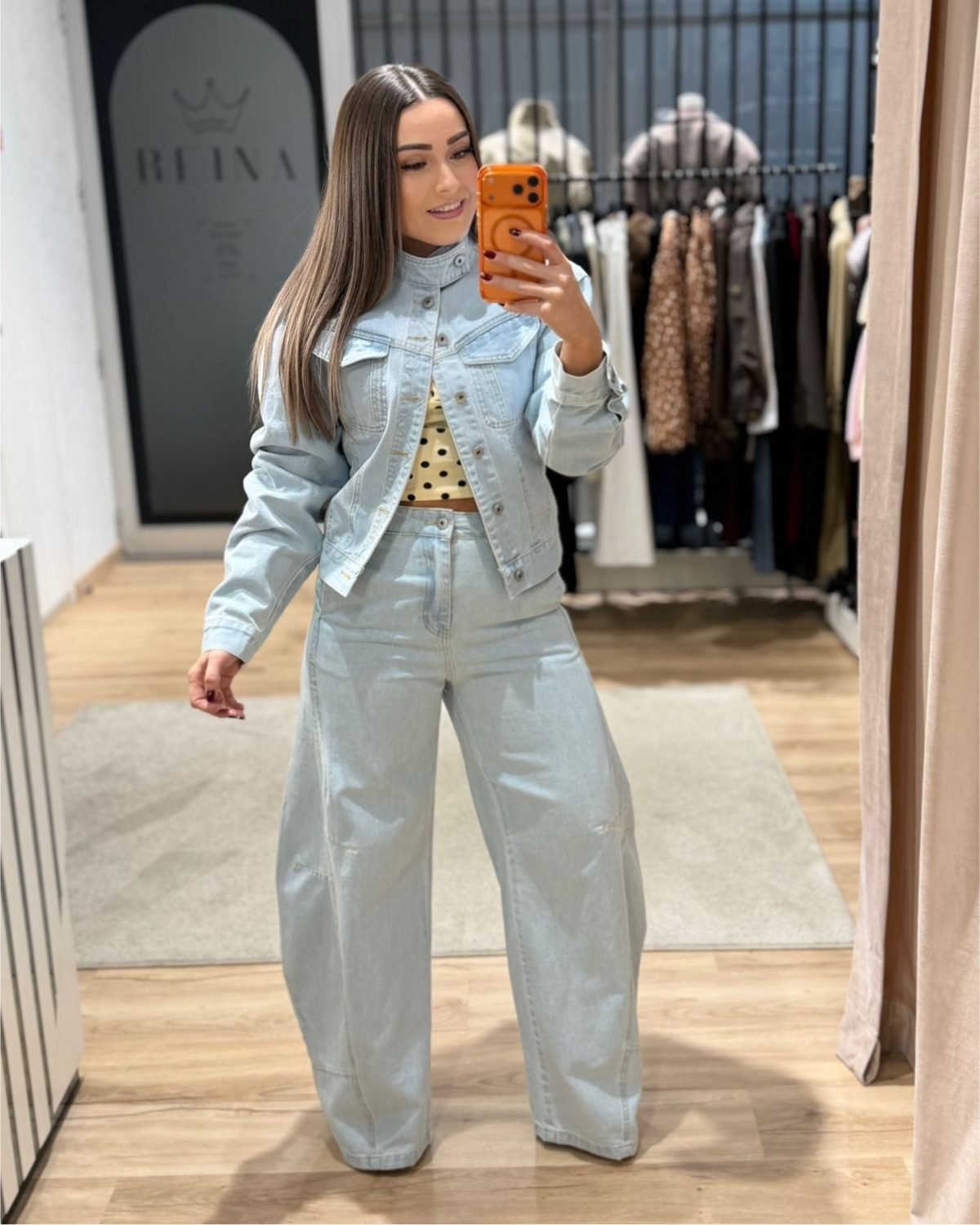 O conjunto inclui casaco de ganga estruturado e calças com perna larga, criando um visual equilibrado e muito atual. A ganga clara dá aquele toque fresco e fácil de combinar, perfeito para usar com tops, camisolas ou até algo mais ousado por baixo.