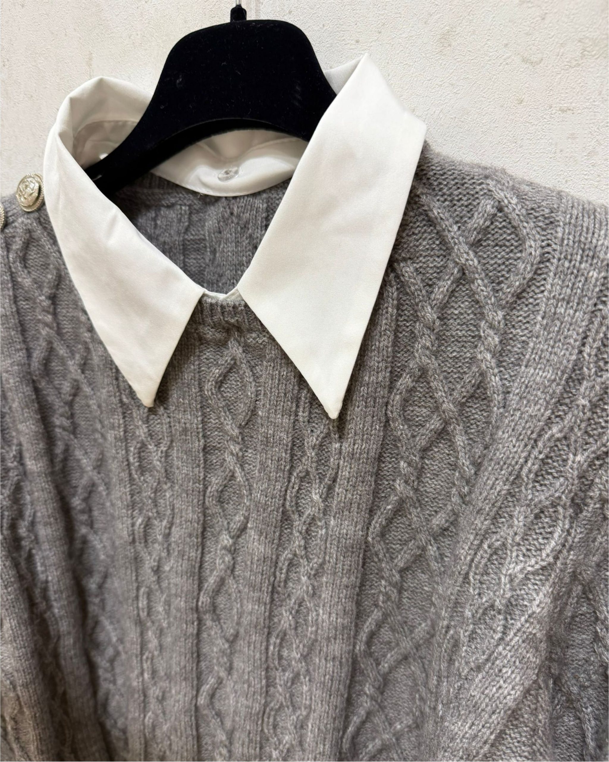Malha em tom cinza, super confortável, o colarinho branco integrado cria aquele efeito de camisa por baixo, prático e sempre elegante. Nos ombros, os botões dourados trazem um detalhe clássico que faz a peça destacar-se sem exageros.