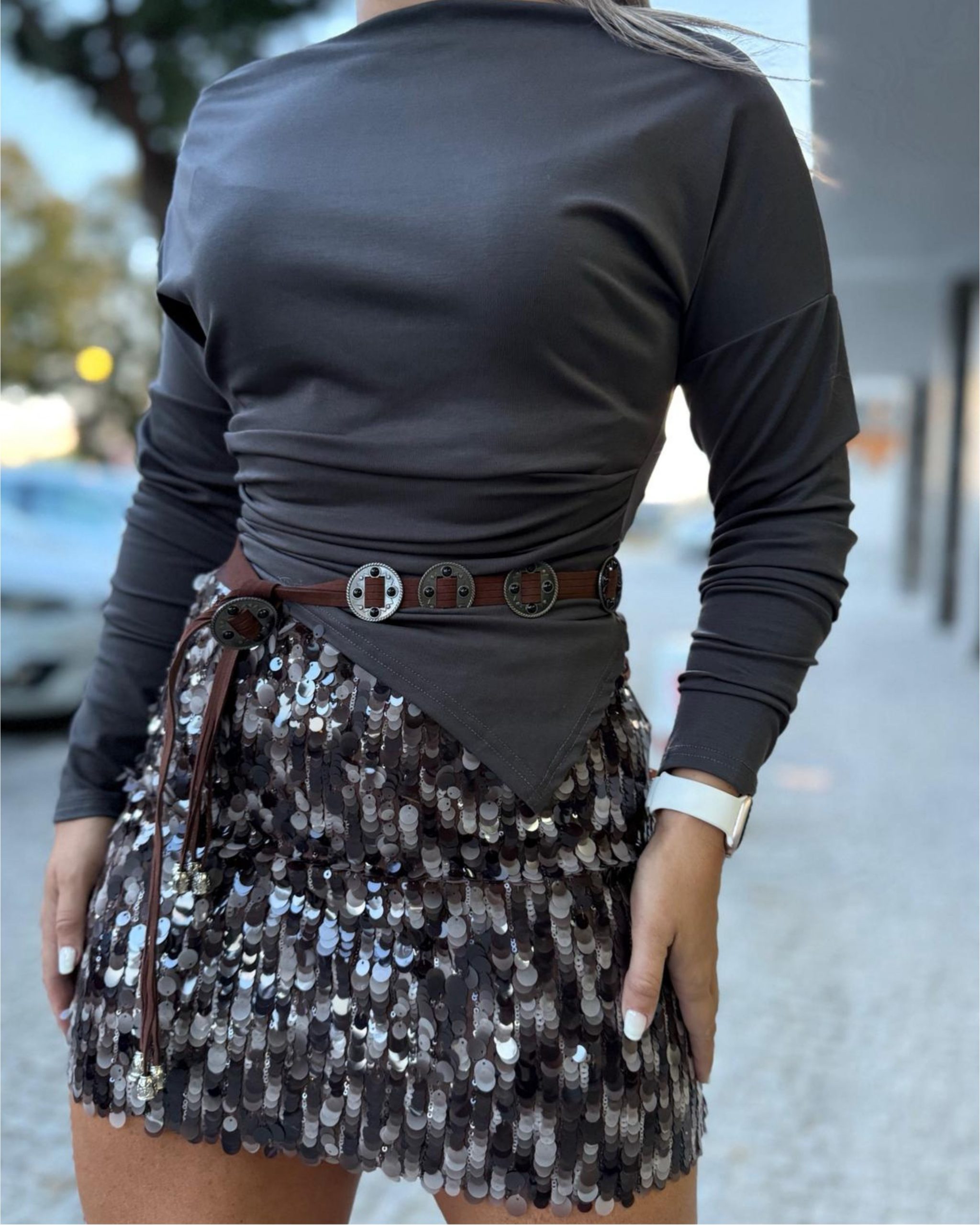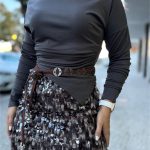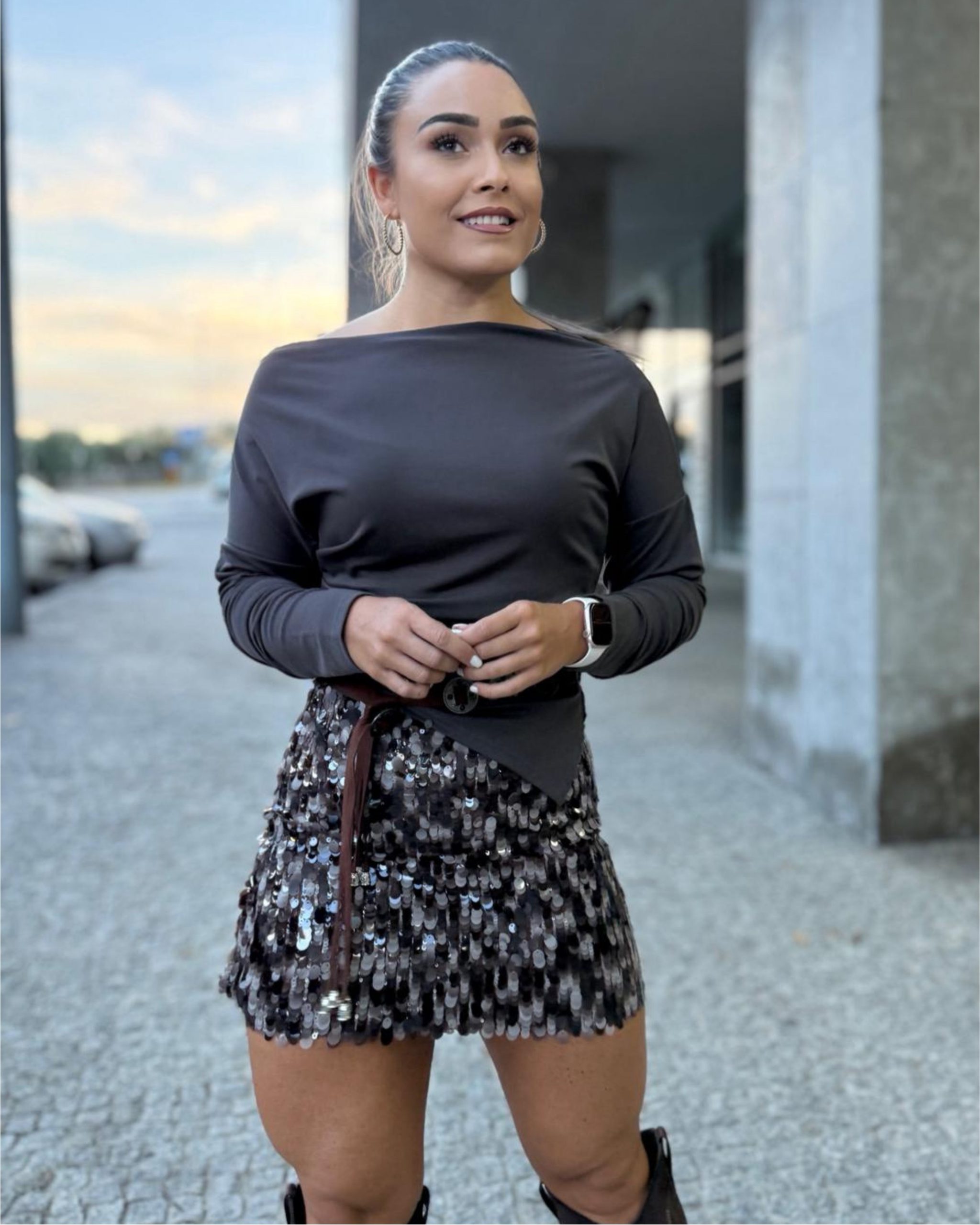 Saia curta cheia de lantejoulas. Ajusta bem à cintura e dá logo um ar marcante, perfeita para sair à noite.