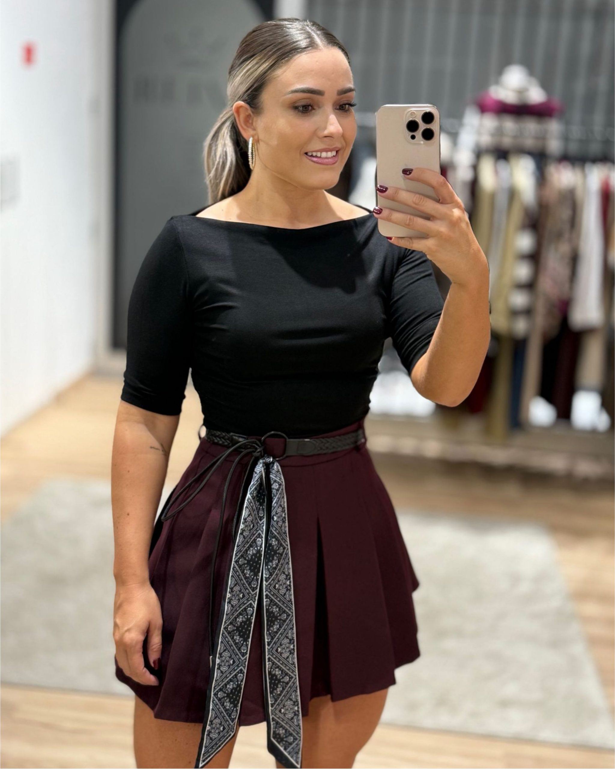 Saia super gira, com pregas que dão aquele toque mais arrumadinho sem perder o estilo. Vem com cinto entrançado e lenço estampado a contrastar, um detalhe que faz toda a diferença!