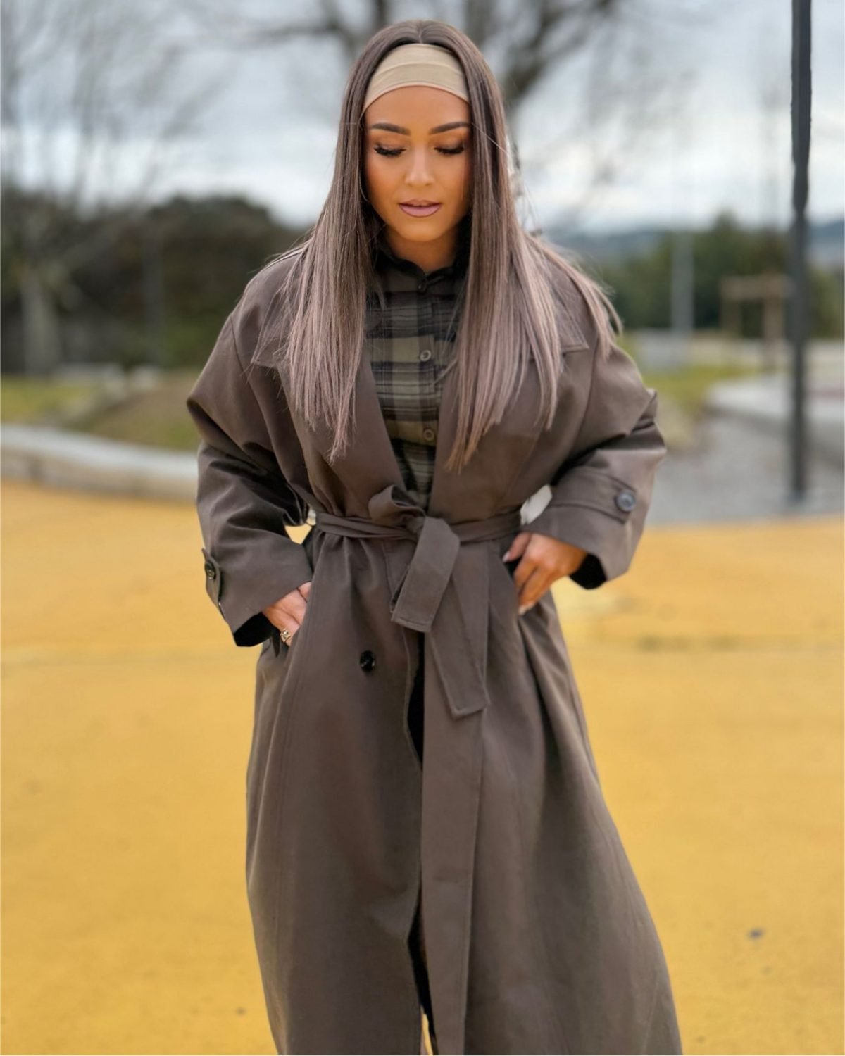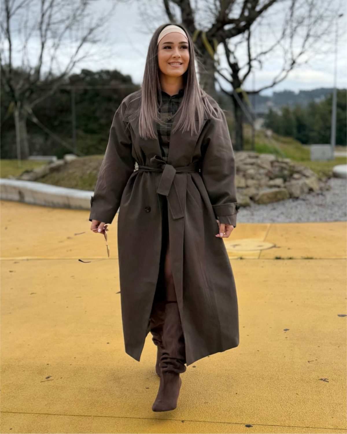 Trench que dá presença ao look sem precisar de exageros. Comprimento midi, corte solto mas com cinto para marcar a cintura. Funciona com botas, ténis ou saltos, é vestir e sentir o look completo.