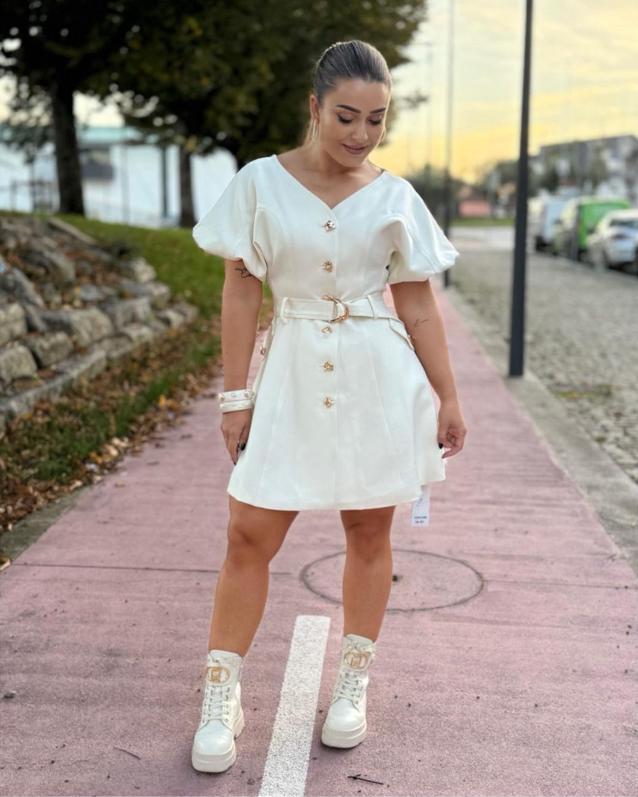 Vestido Mochy super elegante em tom OFF WHITE, com botões dourados cheios de estilo e cinto a marcar a cintura. As mangas abalonadas dão-lhe um ar moderno e feminino, perfeito para quem gosta de se destacar com um look simples mas marcante. Ideal tanto para o dia como para a noite.